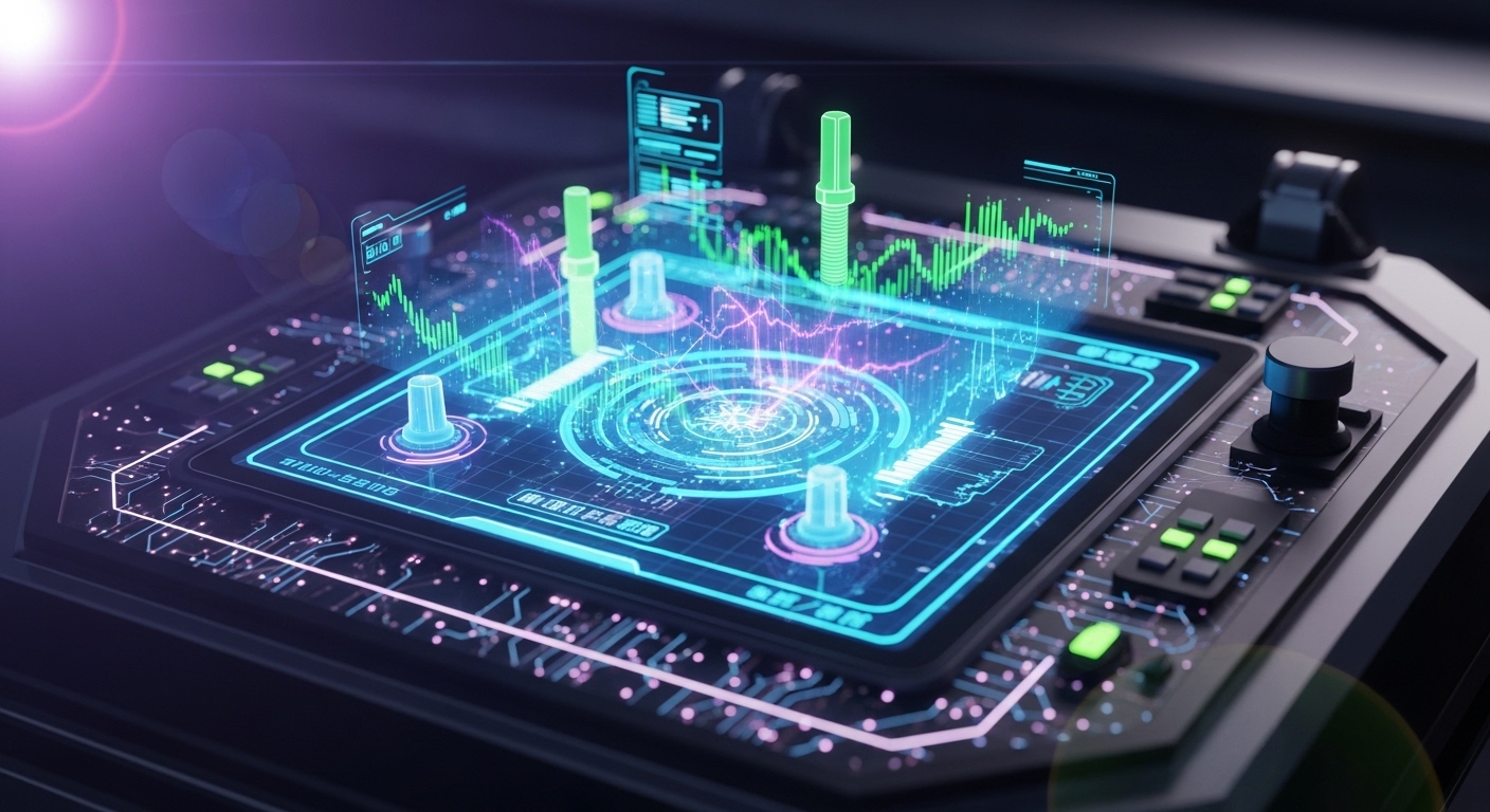 A futuristic holographic interface composed of layered panels, fluid motion, and particle interactions. Designed to convey a system that's tactile yet ethereal.